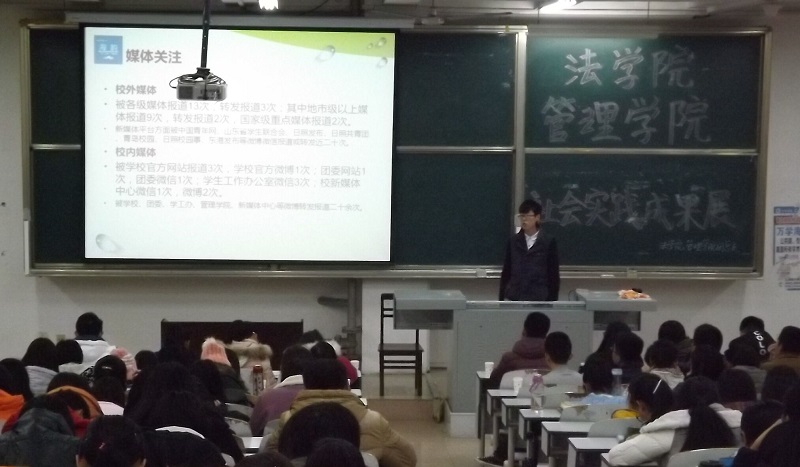 活动伊始,精彩的视频展示了社会实践的精彩瞬间。我院海韵“四个全面”观察团主讲人朱灏向大家展示了日照东港区开发情况。他详细地介绍了其实践的过程以及调研过程中发现的问题和针对这些问题提出的方法和建议,并指导同学们如何完成实践报告。我院“康启实践团”的主讲人袁晟睿以“山东寿光蔬菜供应链现状研究”为课题进行了社会实践成果展示。他强调以专长服务社会,并结合自身经历为大家悉心讲解。法体育博彩平台