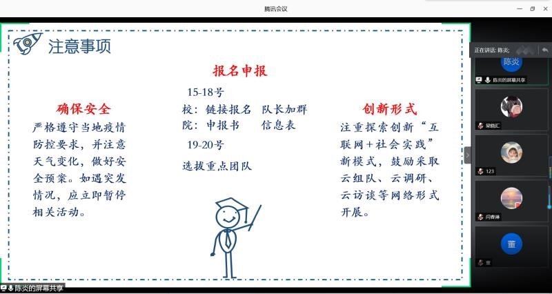 会议伊始,体育博彩平台 团委副书记霍连升分享实践经验及感受,他表示自己多次参与社会实践活动,其中既有困难和挫折,也有喜悦和收获,我们要勇敢迎接挑战,抓住机遇,方能成功。他从自身经历出发,从活动的意义、前期的规划以及实地的调研等方面为同学们做出了精彩讲解。随后,社会实践部部长陈炎就活动介绍、实践流程、注意事项三方面展开讲解,鼓励同学们积极参与,提前接触社会,增长见识,提高技能。同时,陈炎提醒大家,一切以安全为主。线上宣讲会结束,同学们纷纷表示受益匪浅,对此次实践活动有了明确的定位和目标。