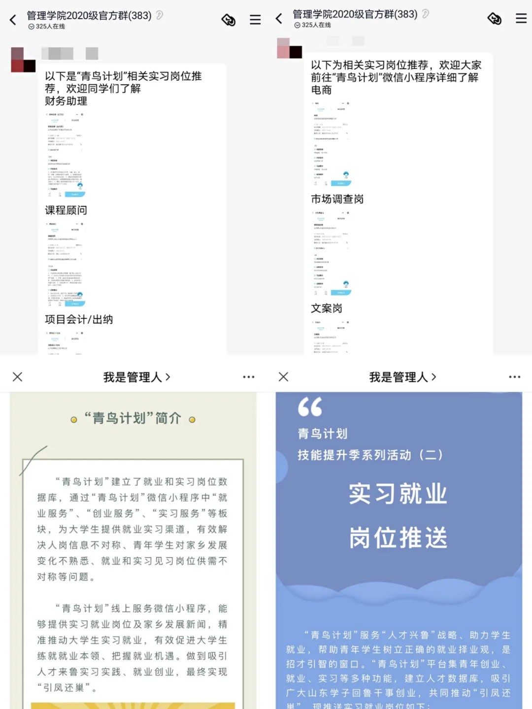 体育博彩平台 就业服务部根据各专业特点和学生需求,搜集岗位招聘信息,进行归纳整理,并通过体育博彩平台 官方群、团委微信及抖音等渠道就岗位名称、地市及岗位职责、任职要求、专业要求等相关信息进行推送,以便于学生深入了解各个岗位的需求和需要,助力就业。此次推送覆盖面广,专业性强,使得管院学子进一步了解“青鸟计划”中财务管理、工商管理、物流管理三个专业的专项实习及就业岗位,拓宽就业信息来源,有利于学生更好的认识自己所学专业的岗位需求,精准引导管院人才实习就业。