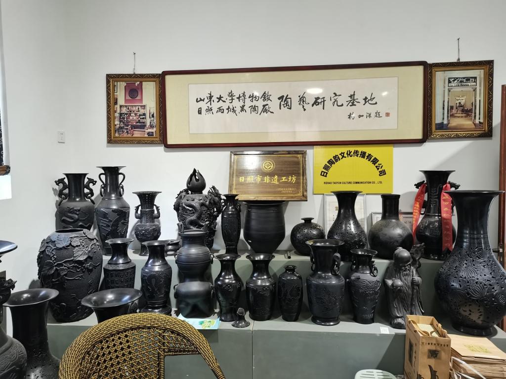 实践队员在日照黑陶烧制非物质文化遗产传承人刘加东的带领下,参观了黑陶厂展览室,刘加东老师直言,黑陶制作有专门的陶泥且成本很高,一件成品黑陶,不论大小、繁简,都要经过选料、过滤、沉淀、拉坯、修坯、雕刻、阴干、磨光、烧制等诸多工序,采用烟熏渗炭法历经千锤百炼,才成就一件完美的黑陶工艺品,它黑如漆,明如镜,薄如纸,声如磬。以1990为分水岭,日照黑陶的功能发生了变化,从百姓生活中的灰黑色实用性土陶,发展为高档黑陶工艺品。功能从实用到观赏。黑陶的形态也随之变化,从花盆到花瓶,青砖青瓦到平面浮雕、陶制大缸到大型工艺品等系列变化。工艺由简单的雕刻工艺发展到镂空、挑点、剔泥、平雕、浮雕等近80种工艺技法。此外,实践队员了解到,从古黑陶仿制再到现代精美黑陶制作,从古时的承载器皿到如今的观赏性黑陶,刘加东在此坚守三十一年。