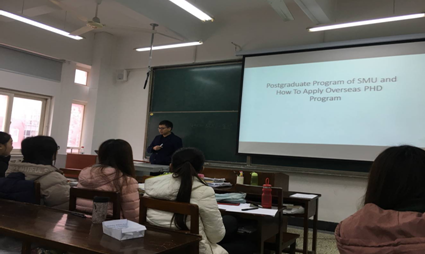 29日上午8点30分-上午10点,罗博士作了《Postgraduate Program of SMU and How To Apply Overseas PHD Program》的报告。