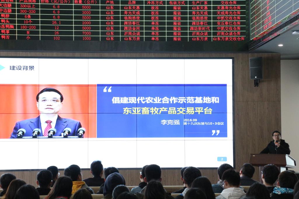 体育博彩平台 一行首先到达中国食品谷•中凯智慧冷链物流园交流学习。在工作人员的带领下,师生先后参观了60万吨容量冷库群、食品物流中心、东亚畜牧交易所、大型农产品(食品)交易市场等实体板块,系统了解集仓储、物流、金融、交易等多种服务功能于一身的智慧物流园架构。其中在东亚畜牧交易所板块,工作人员向师生详细讲解了“中国食品谷号”潍坊至昆明铁路冷链班列、“中国食品谷号”潍坊至乌鲁木齐铁路冷链班列、山东至云南汽运专线等新举措,分析全程冷链物流的优势和发展空间。工作人员表示,日后将陆续建立起覆盖全国范围的生鲜农产品集散大动脉,构建全国一带一路沿线国家的专业化铁路冷链物流服务体系。